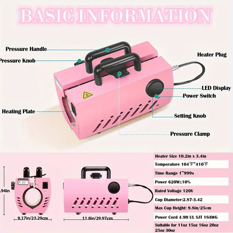 With 620W power, it heats up quickly and distributes heat evenly—so your sublimation designs (like graphics on tumblers) come out smooth, vibrant, and bubble-free. Adjust temp (104℉–410℉) and time (1–999s) for perfect results.