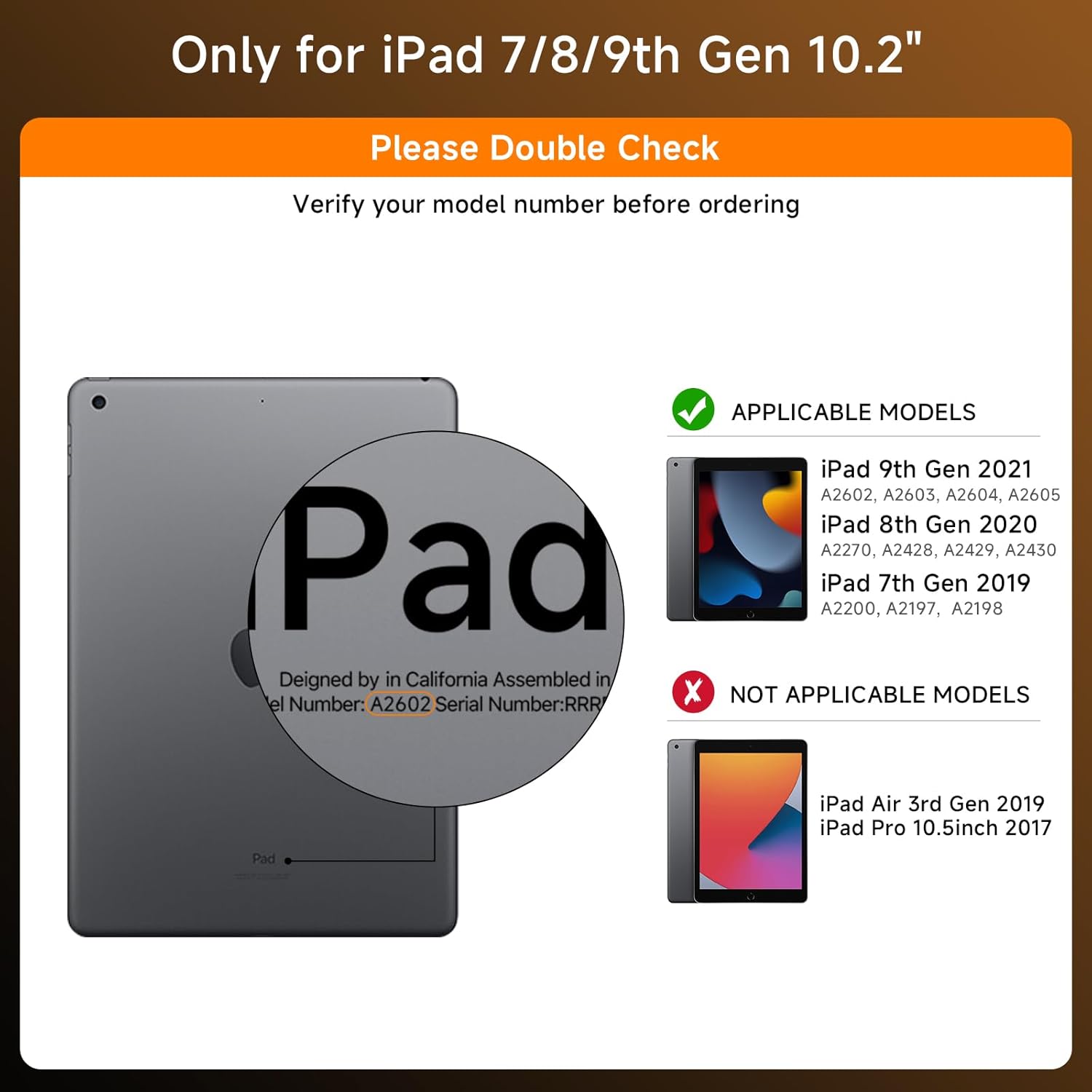 Fits iPad 9th Gen (2021, 10.2 inch) (Models A2602/A2603/A2604/A2605), iPad 8th Gen (2020, 10.2 inch) (Models A2270/A2428/A2429/A2430), and iPad 7th Gen (2019, 10.2 inch) (Models A2200/A2197/A2198). Please check the model number (starting with "A") on the back of your iPad before purchasing to ensure a perfect fit—no wrong buys here!